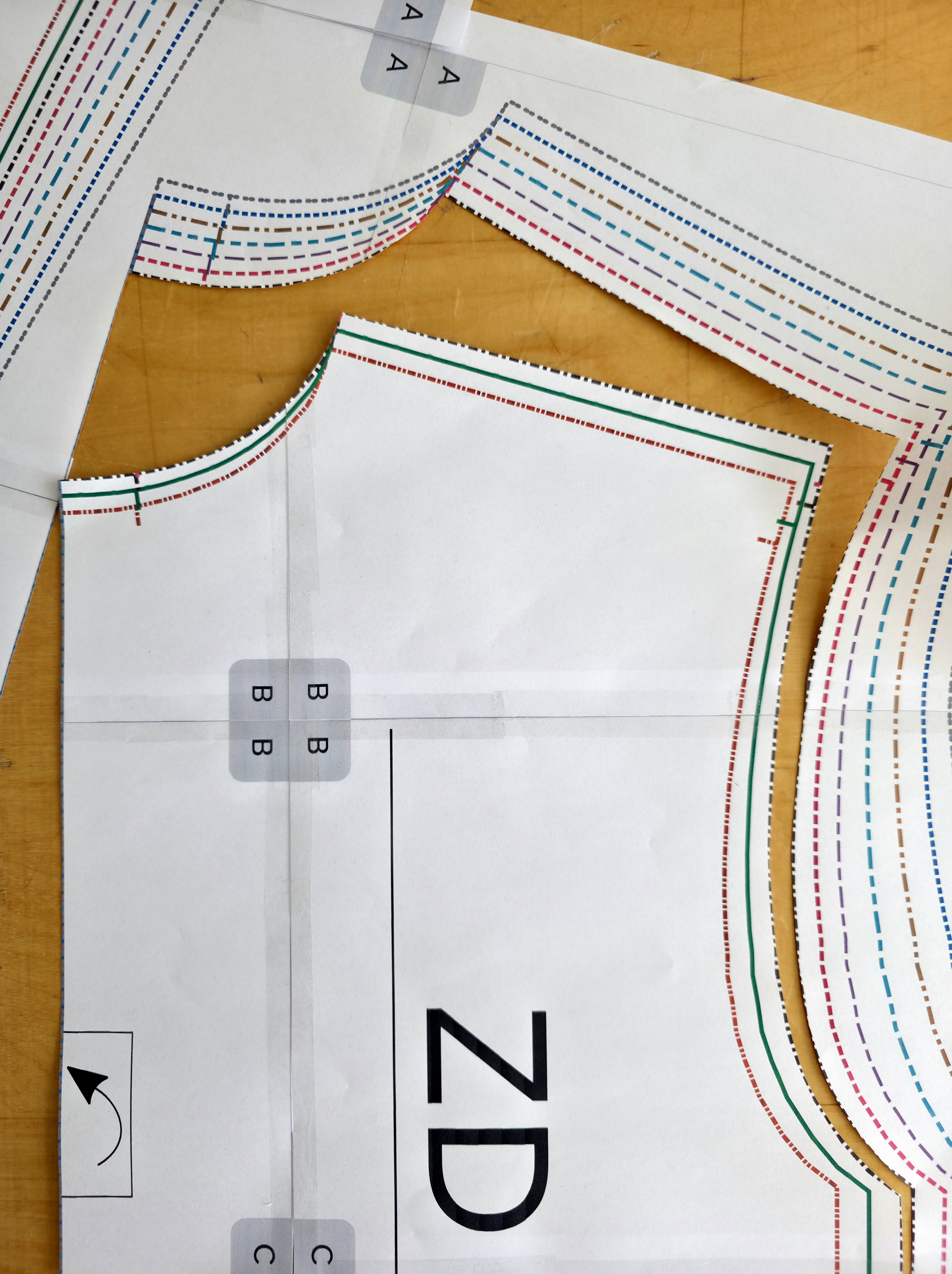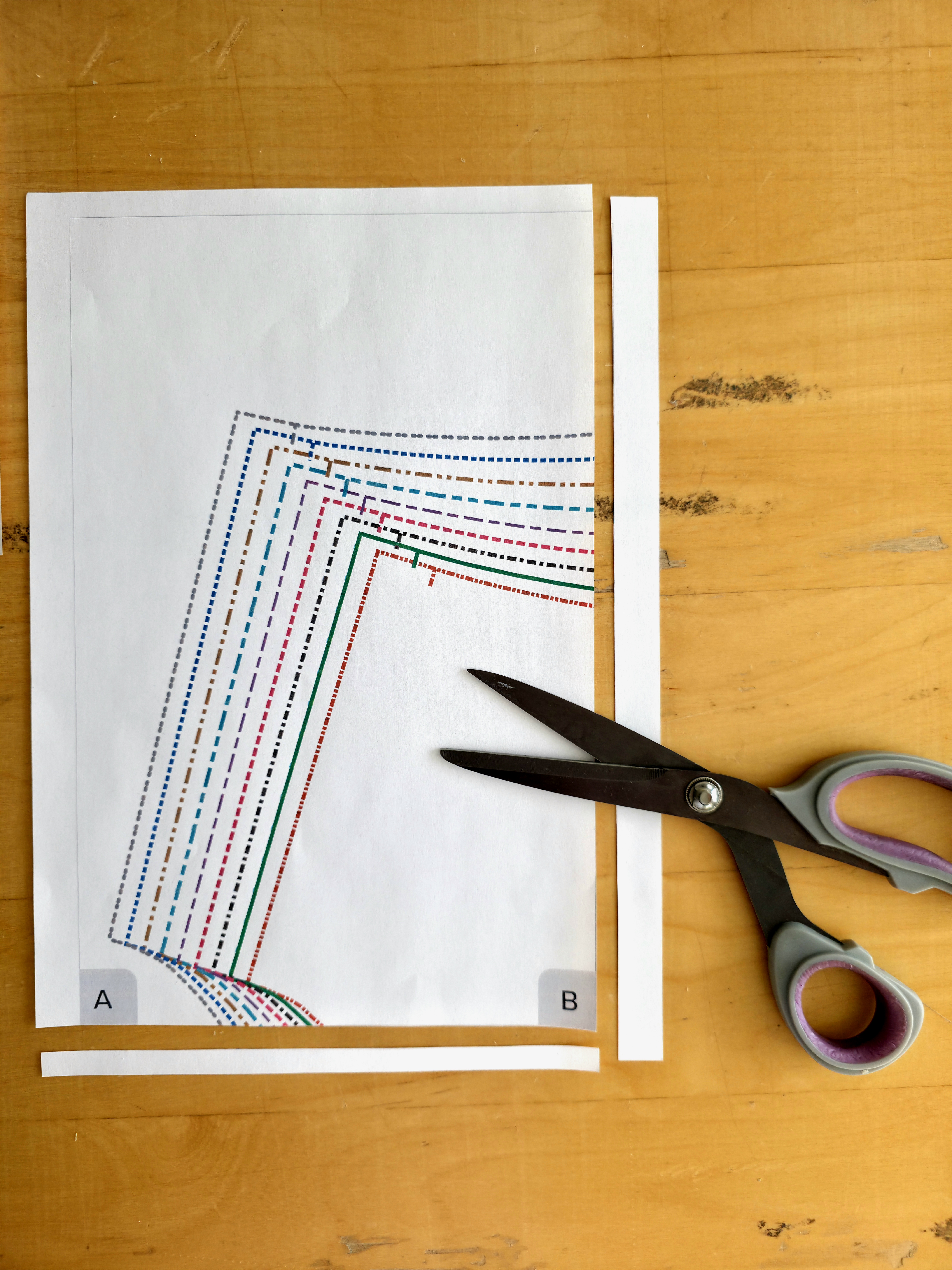 Listy můžete k sobě slepit buď tyčinkovým lepidlem, nebo slepit lepicí páskou. Já volím lepicí pásku a pásku používám pouze uvnitř nebo podél okrajů dílů střihu. Obvykle nejprve listy spojím malým kouskem izolepy a později se vrátím a v případě potřeby přidám další lepicí pásku, abych díly střihu zpevnila a pořádně spojila.