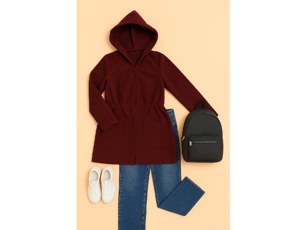Postava typu hruška (užší ramena, širší boky) – delší délka zakrývá boky a kapuce vyvažuje ramena, takže postava působí vyrovnaně.